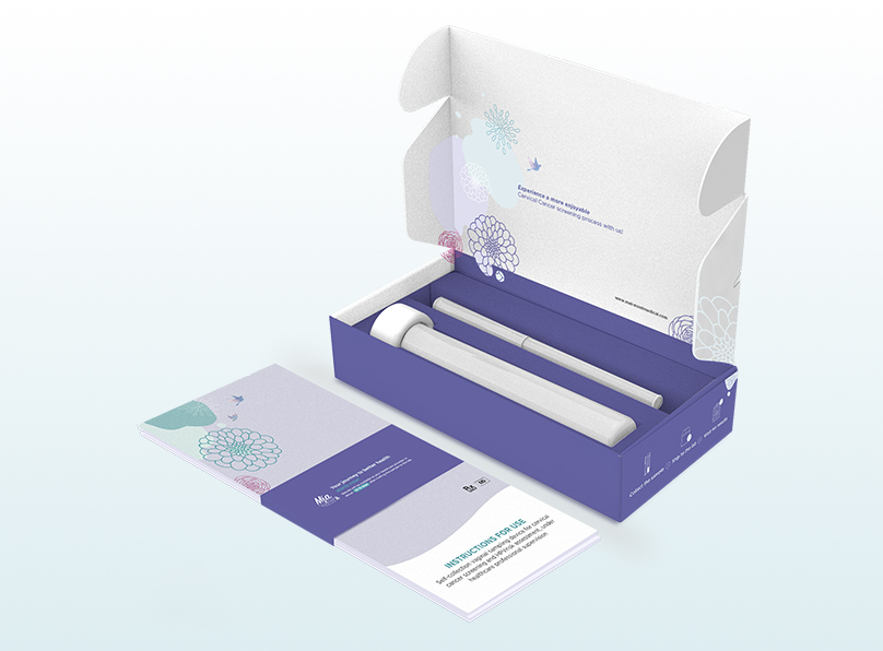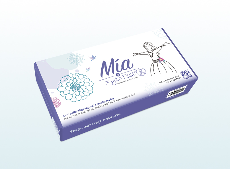 Mía by XytoTest® is a self-collection vaginal sampling device for cervical cancer screening and HPV risk assessment, under healthcare professional supervision.